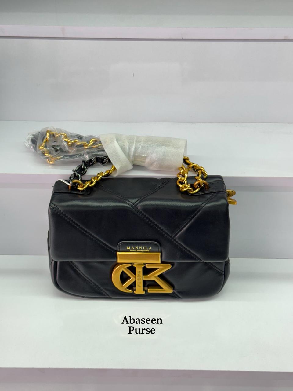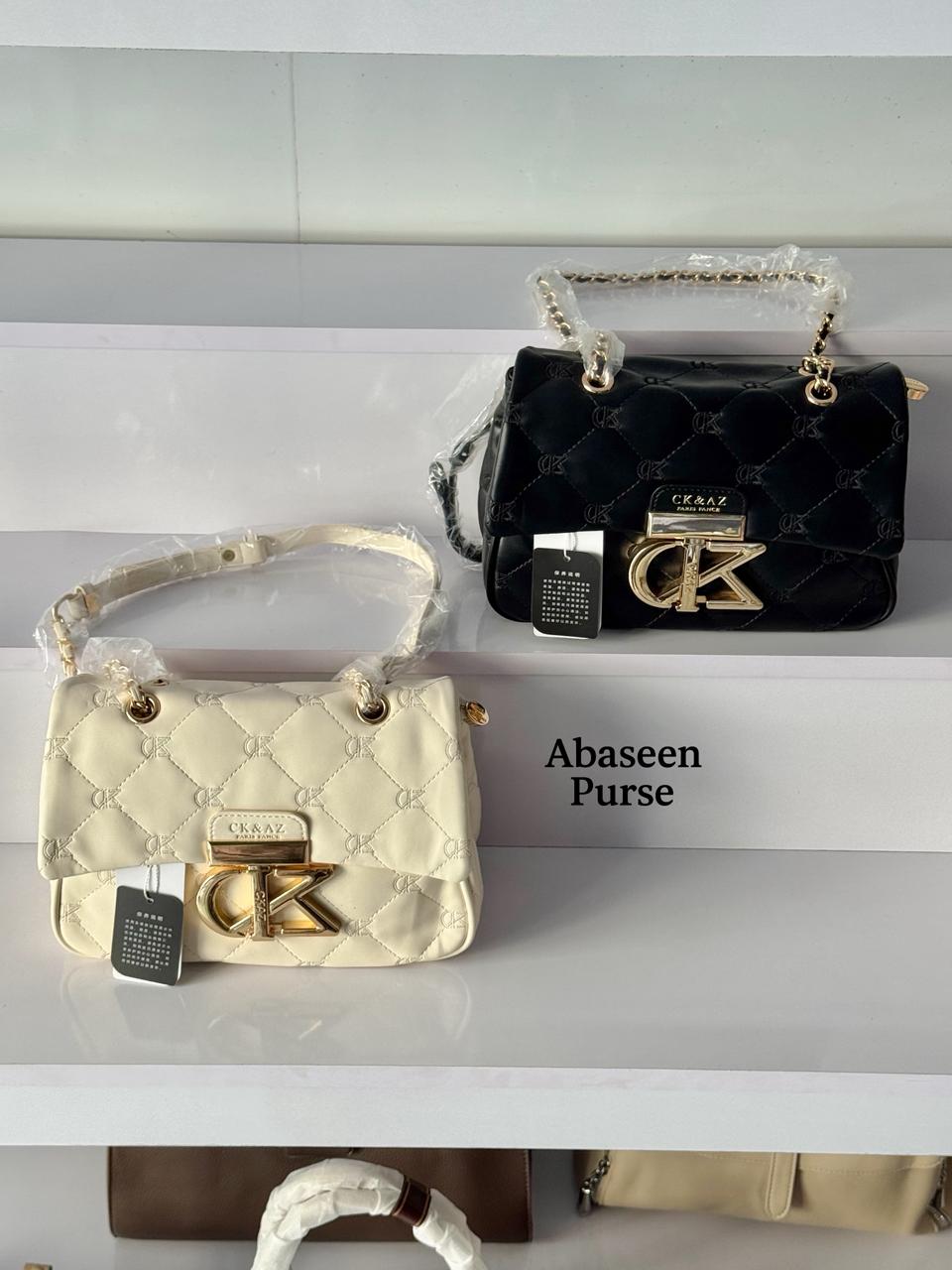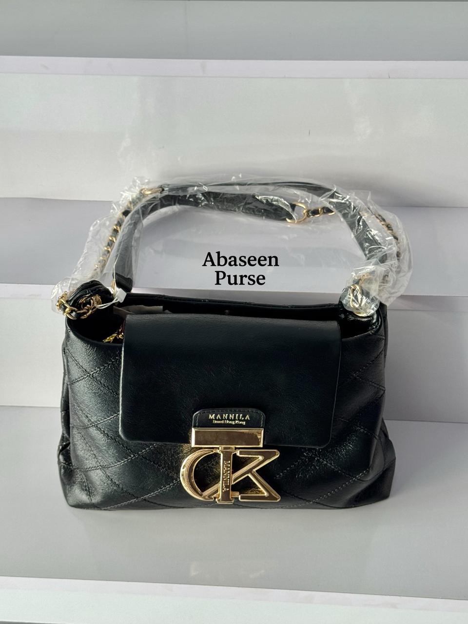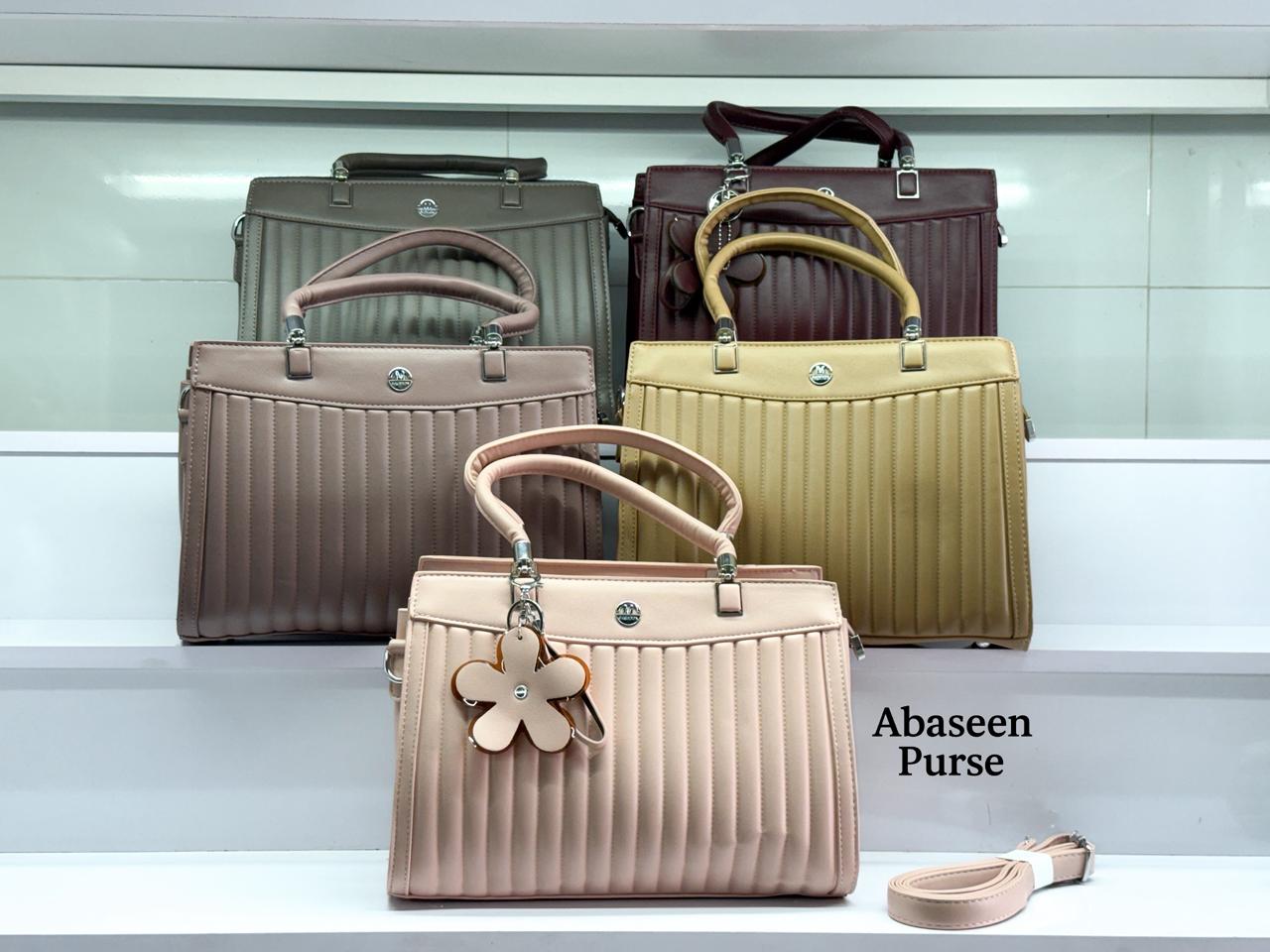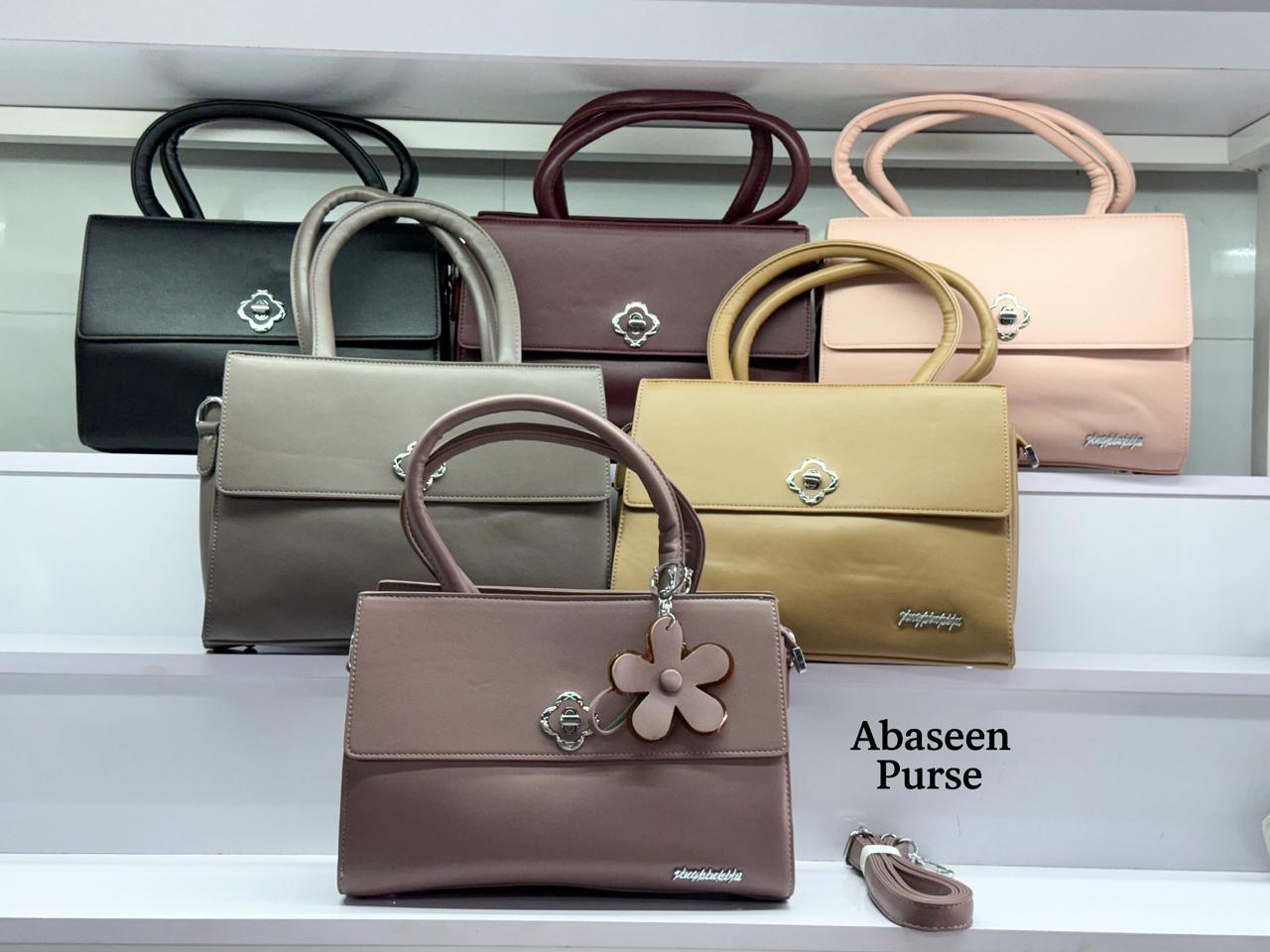 Abaseen Purse is a brand of handbags and purses, with several of its bags featured in the image. The brand appears to have a physical presence in Rawalpindi, Pakistan, and is also found in online stores and social media platforms. The bags shown are in various colors and feature a wrapped handle and a clasp on the front.
