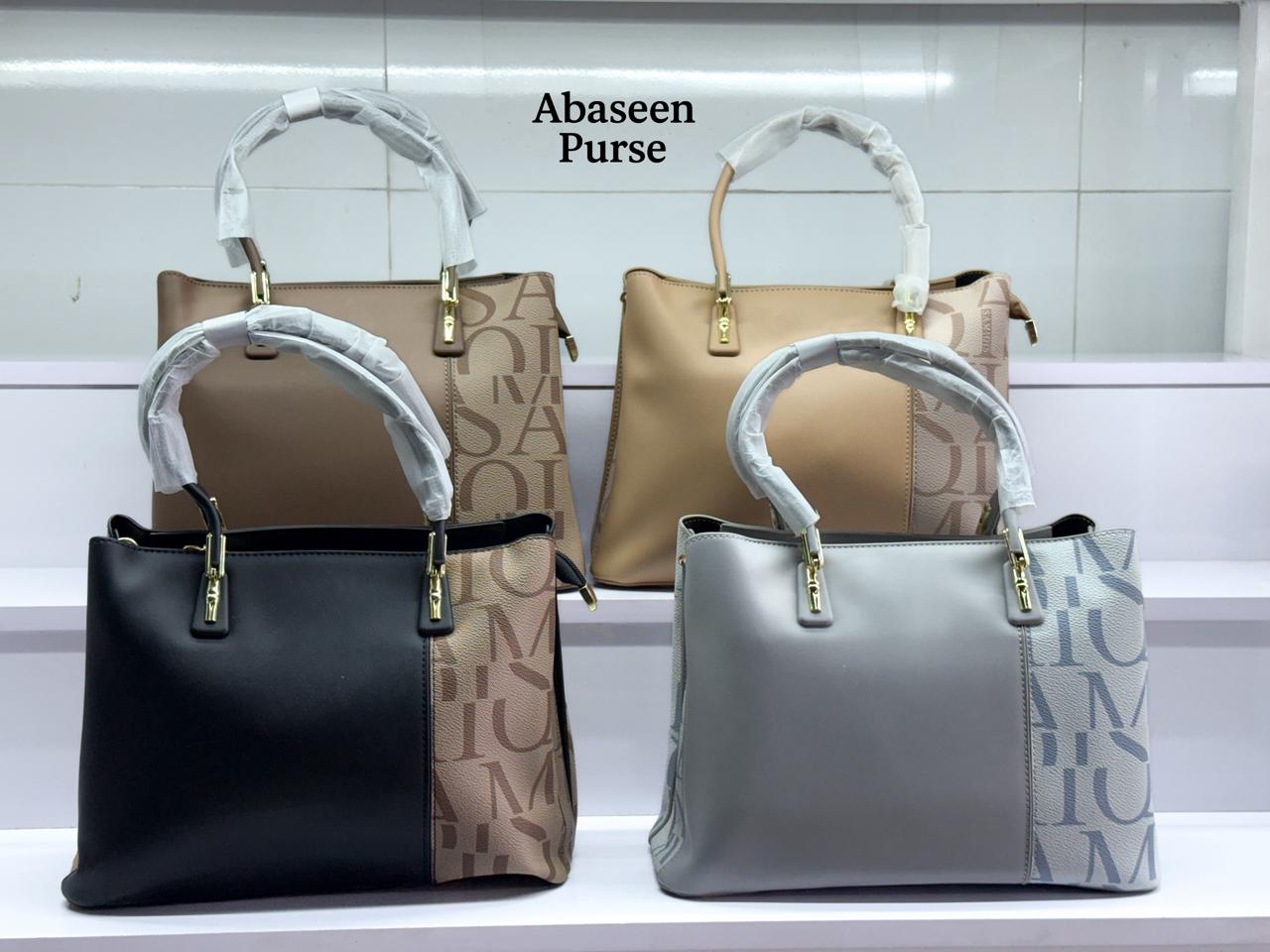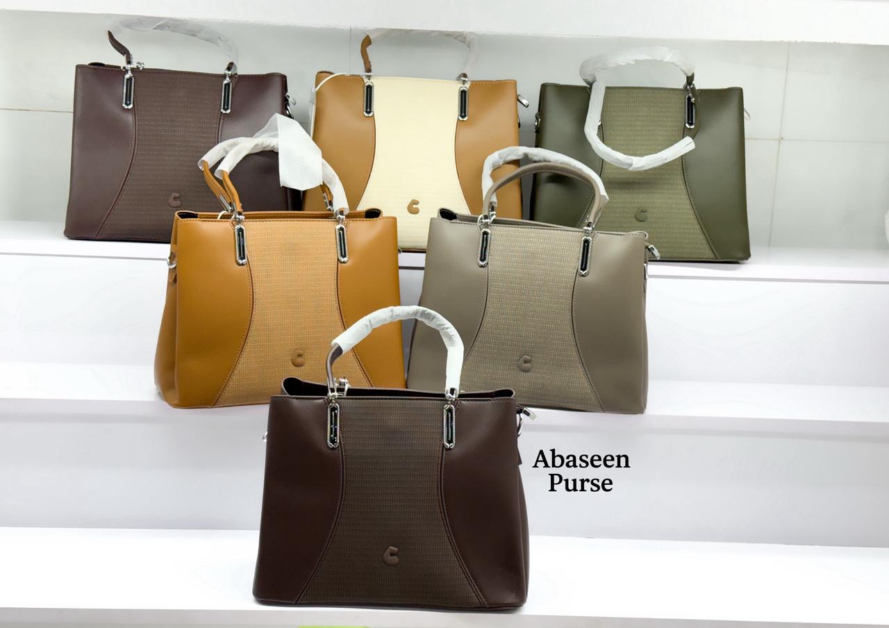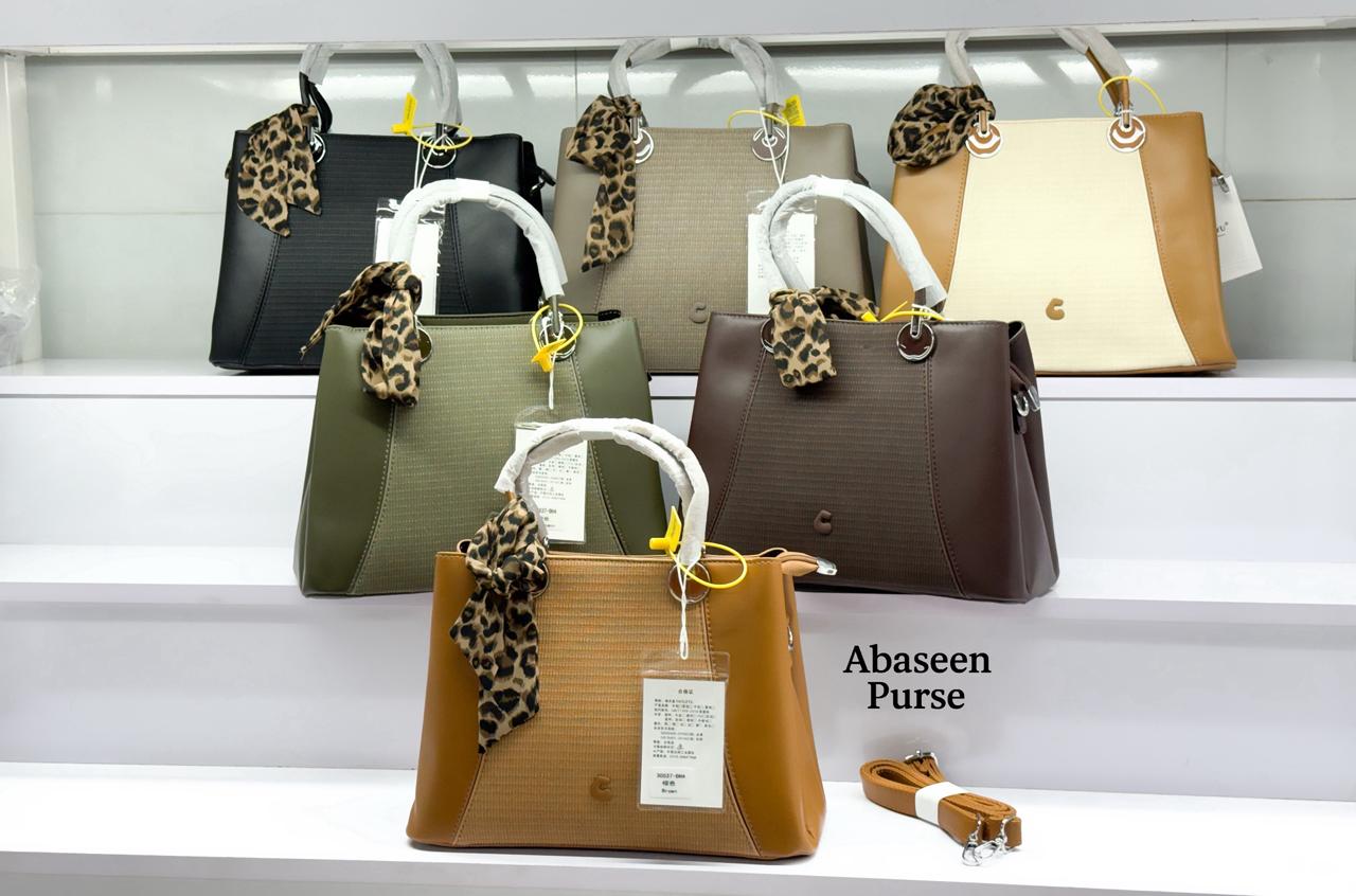 Abaseen Purse is a brand of handbags and purses, with several of its bags featured in the image. The brand appears to have a physical presence in Rawalpindi, Pakistan, and is also found in online stores and social media platforms. The bags shown are in various colors and feature a wrapped handle and a clasp on the front.