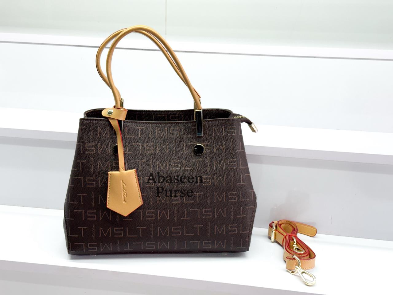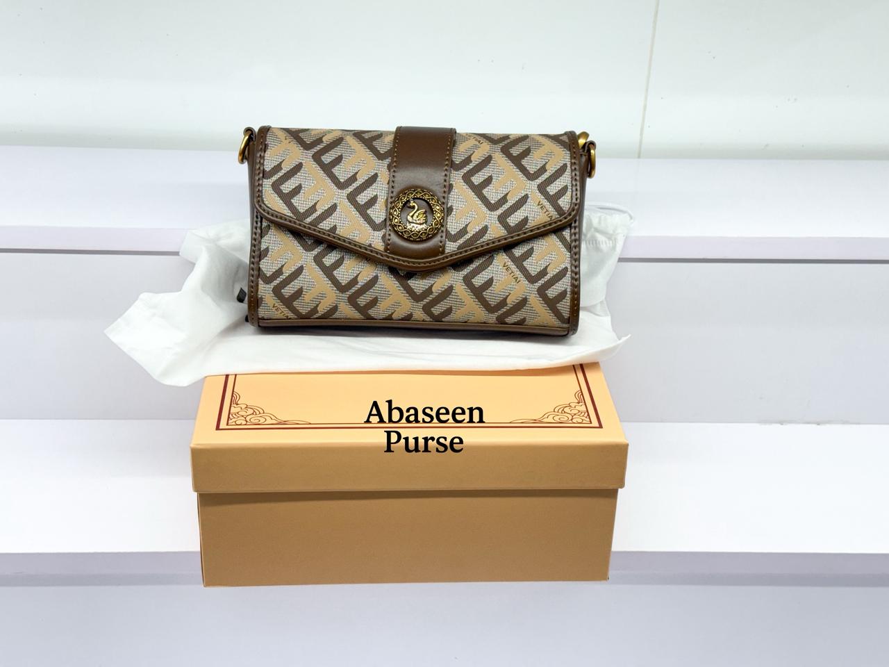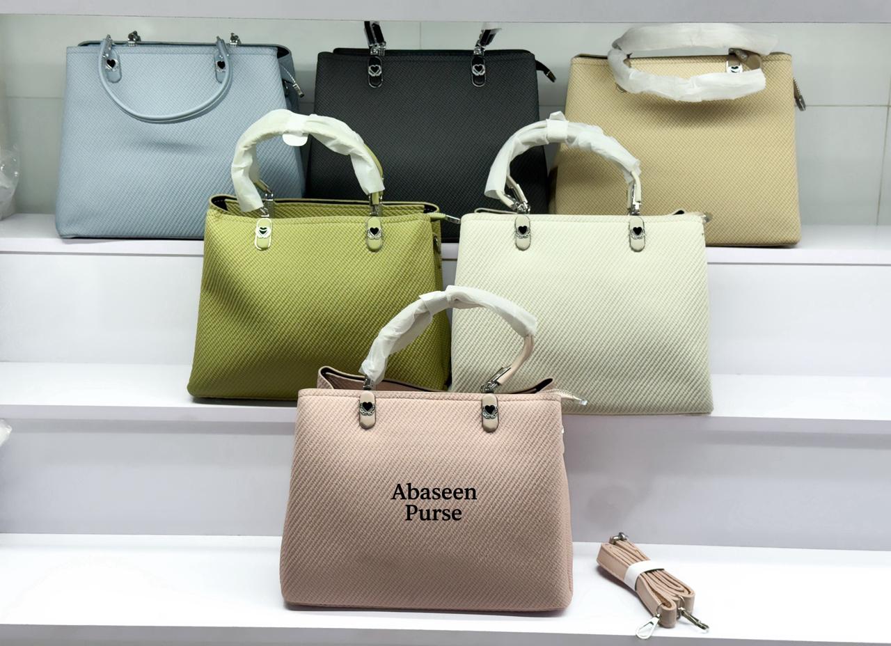Abaseen Purse is a brand of handbags and purses, with several of its bags featured in the image. The brand appears to have a physical presence in Rawalpindi, Pakistan, and is also found in online stores and social media platforms. The bags shown are in various colors and feature a wrapped handle and a clasp on the front.