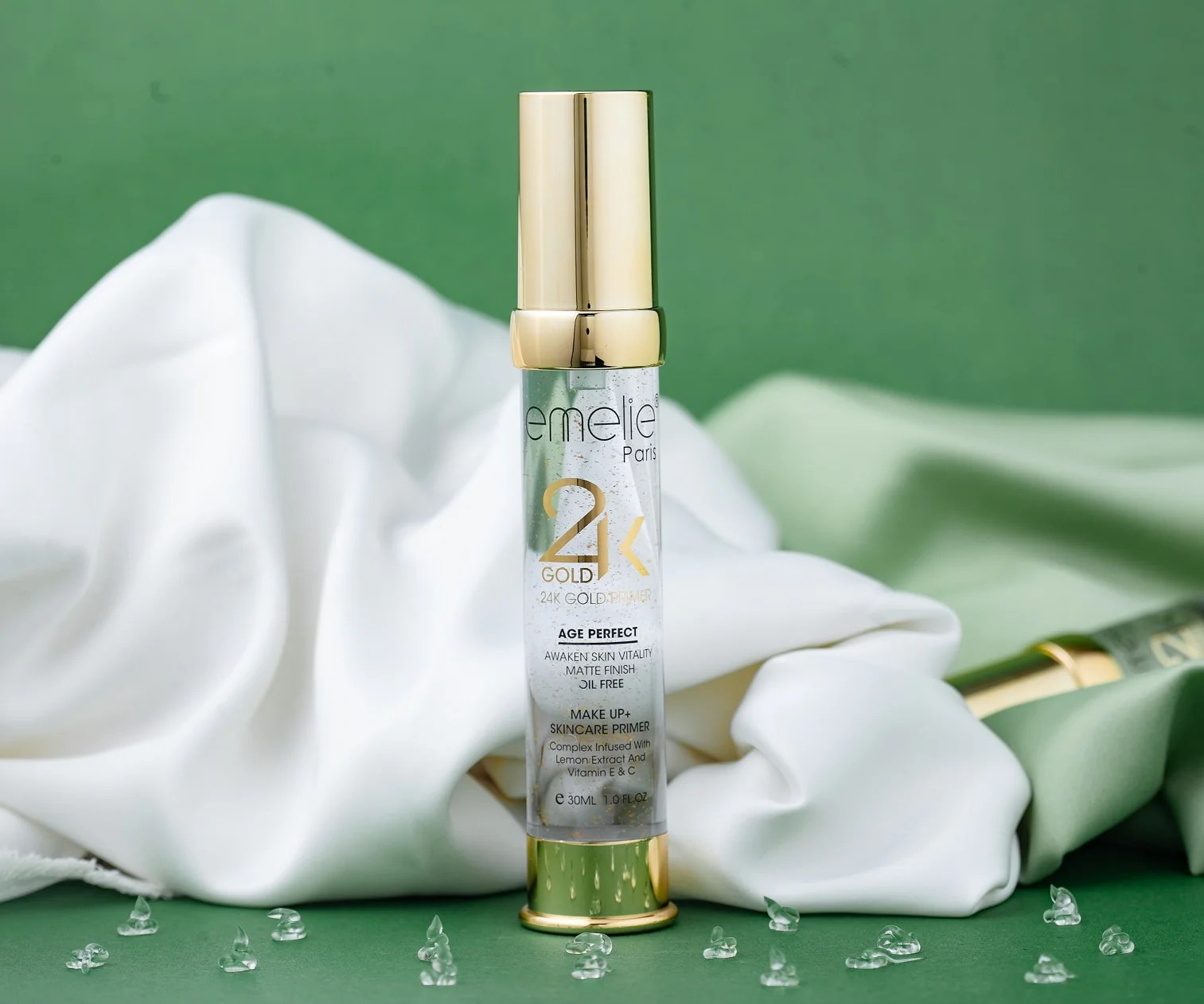 Emelie Cosmetics 24K Gold Makeup + Skincare Primer is a luxurious formula designed to prep, nourish, and illuminate the skin. Enriched with 24K gold particles, it smooths skin texture, minimizes pores, and boosts makeup wear while delivering a radiant glow. Lightweight and hydrating, this primer creates the perfect base for flawless, long-lasting makeup with added skincare benefits.