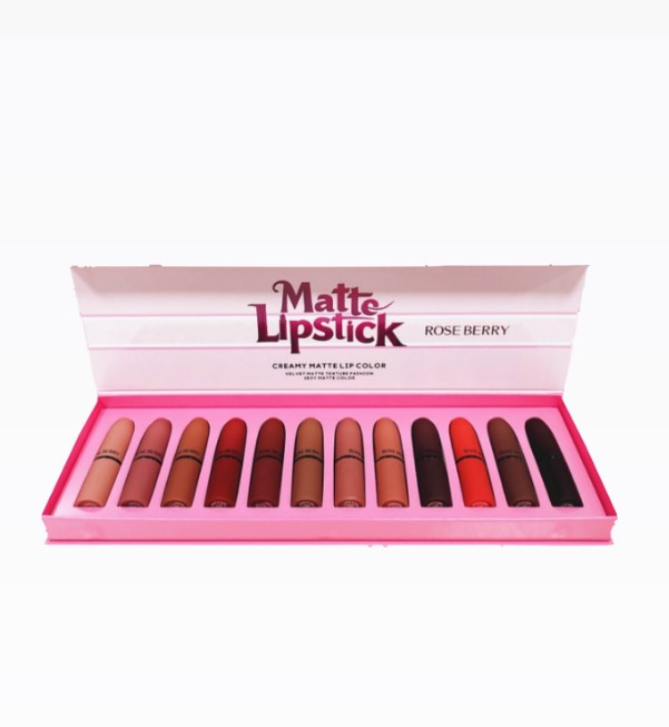 Rose Berry 12 Colors Matte Lipstick Set features a stunning collection of richly pigmented matte shades designed to suit every mood and occasion. With a smooth, creamy texture that glides effortlessly onto the lips, these lipsticks deliver long-lasting color without drying. From everyday nudes to bold statement hues, this set offers the perfect blend of comfort, style, and versatility.