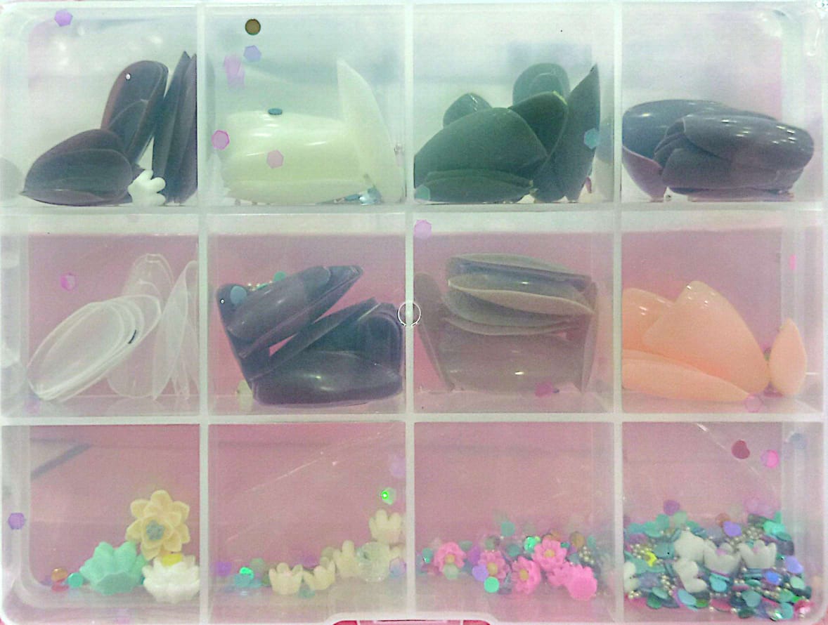 - 12-compartment organizer box: neatly sorted nail tips and decorations